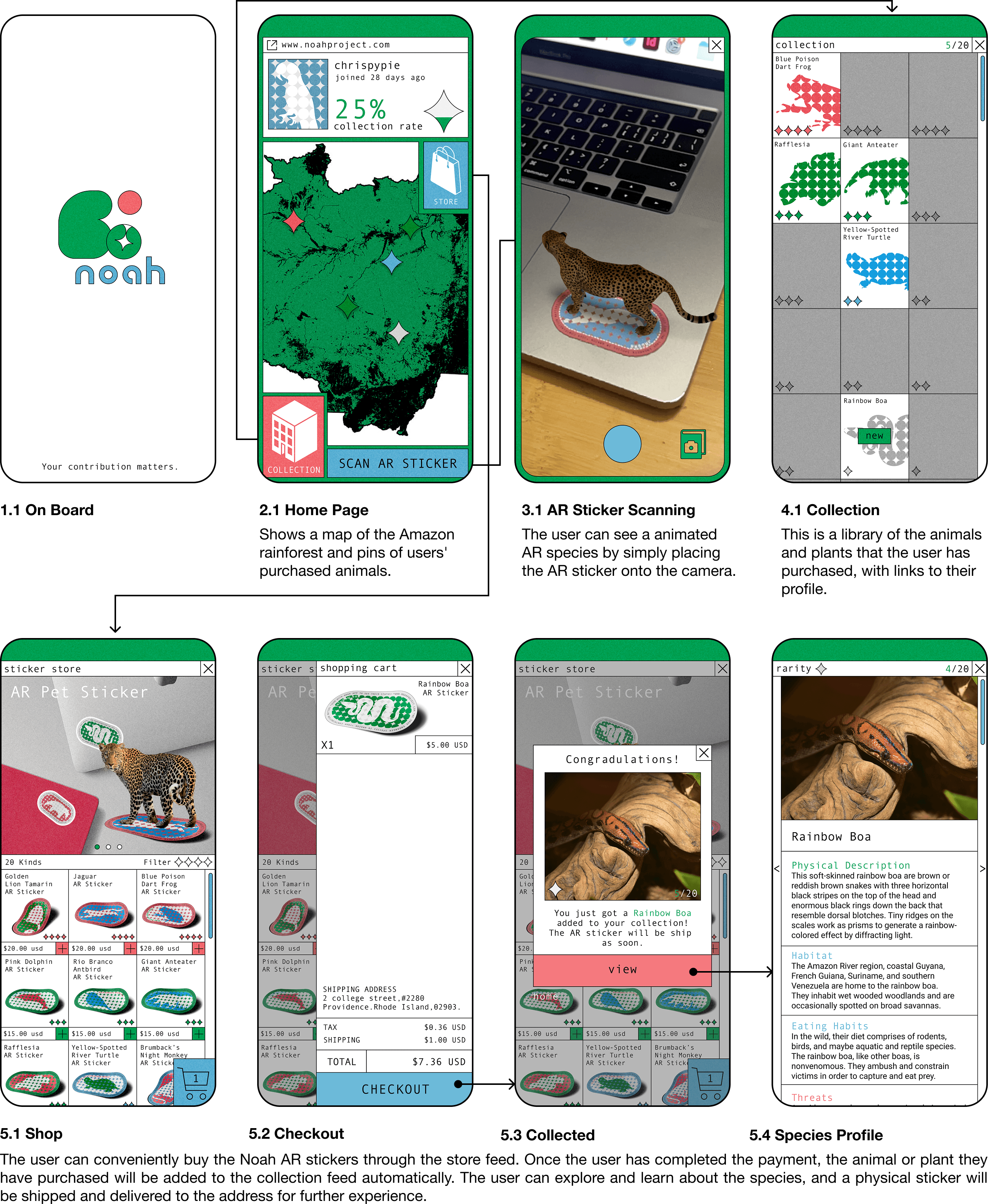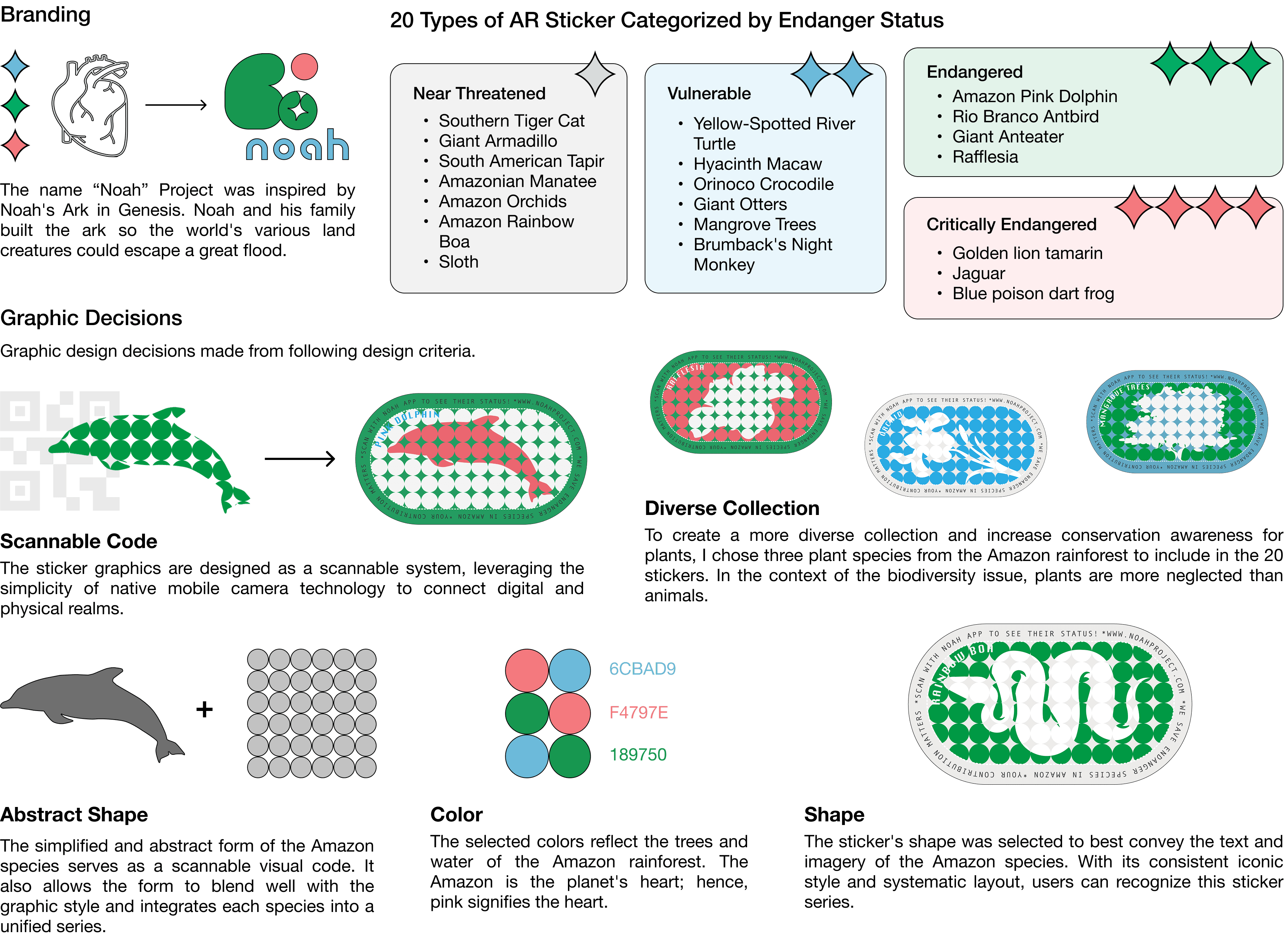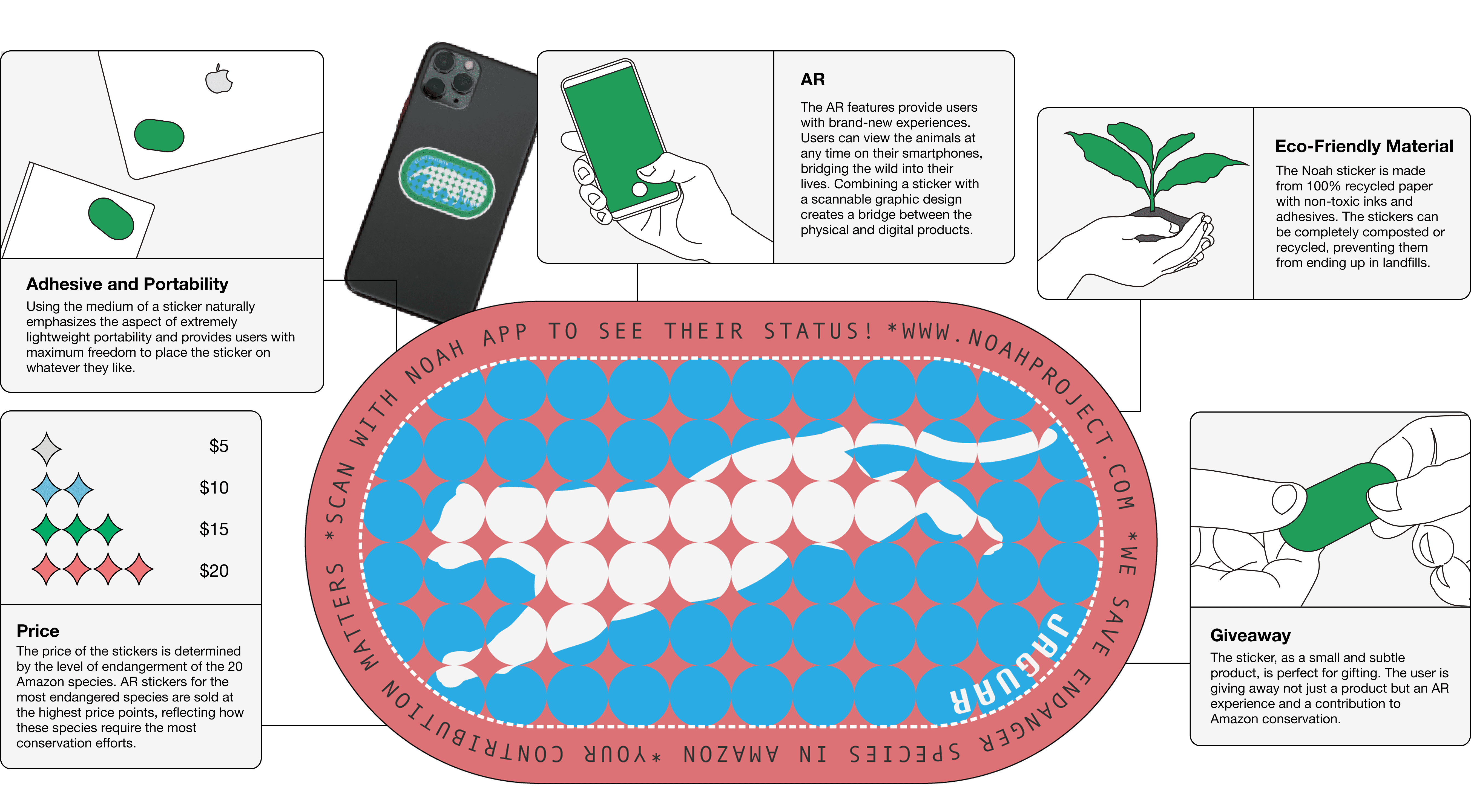 The Noah Project addresses this divide through a three-party system that utilizes immersive technology to bridge urban reality with the Amazonian wild. By integrating sustainable, 100% recycled AR stickers with a mobile application, the project transforms abstract conservation into a tangible and "spreadable" experience. Users purchase eco-friendly stickers that act as physical-to-digital portals; when scanned via the Noah app, these markers trigger animated 3D models of endangered species, providing immediate, measurable feedback on their financial contributions. This "phygital" intervention fosters a proactive environmental community by cultivating biospheric value and reconnecting city dwellers with the very ecosystems they are working to protect.