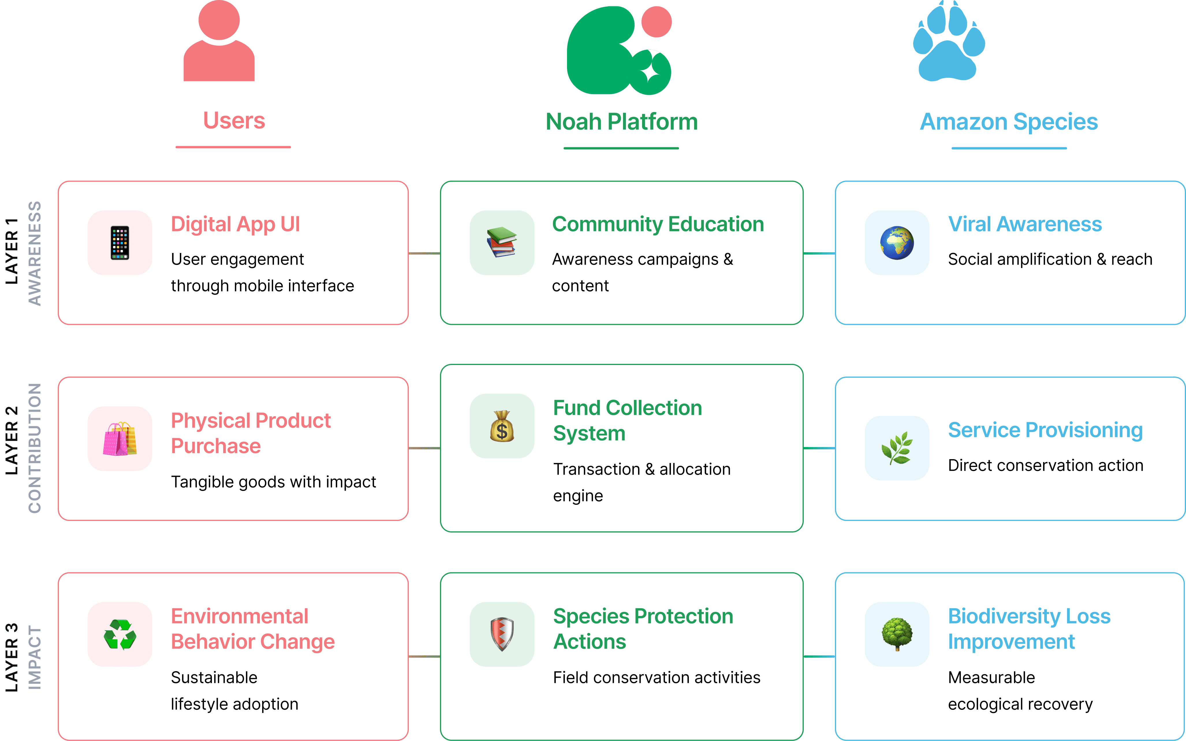 To bridge the Amazon’s endangered species with global users, the Noah ecosystem is governed by three critical pillars: