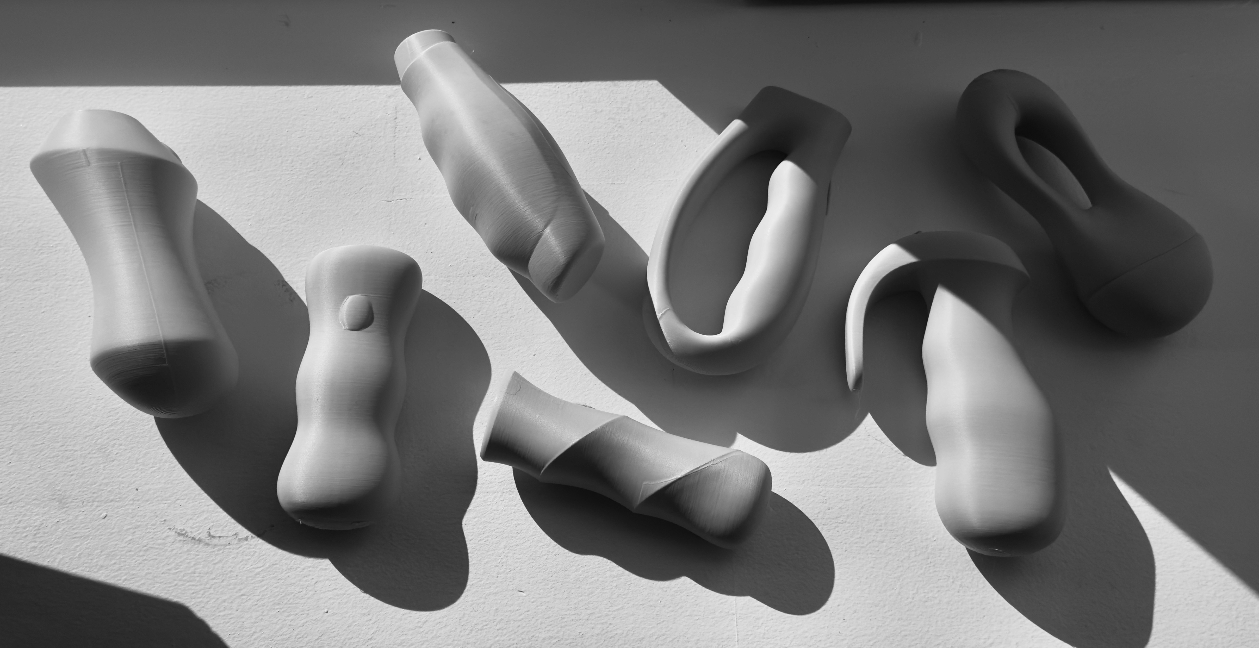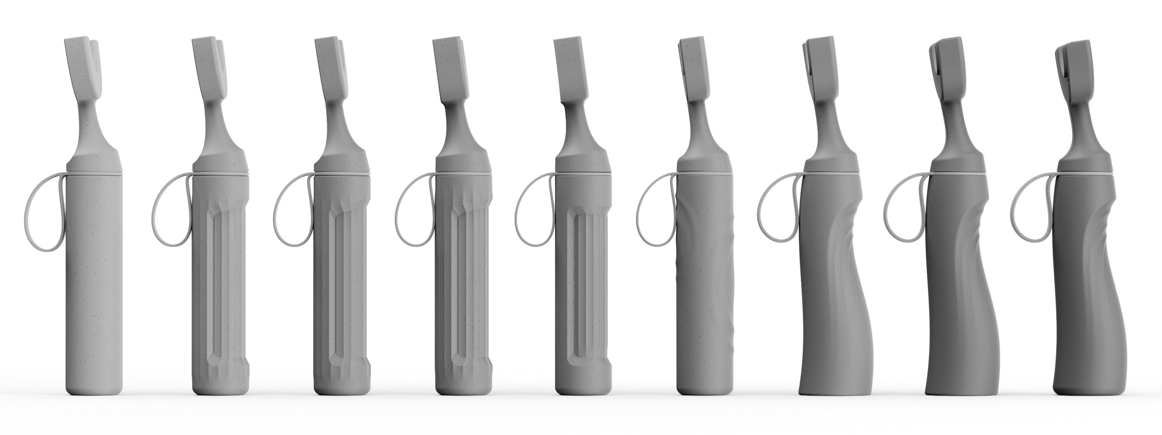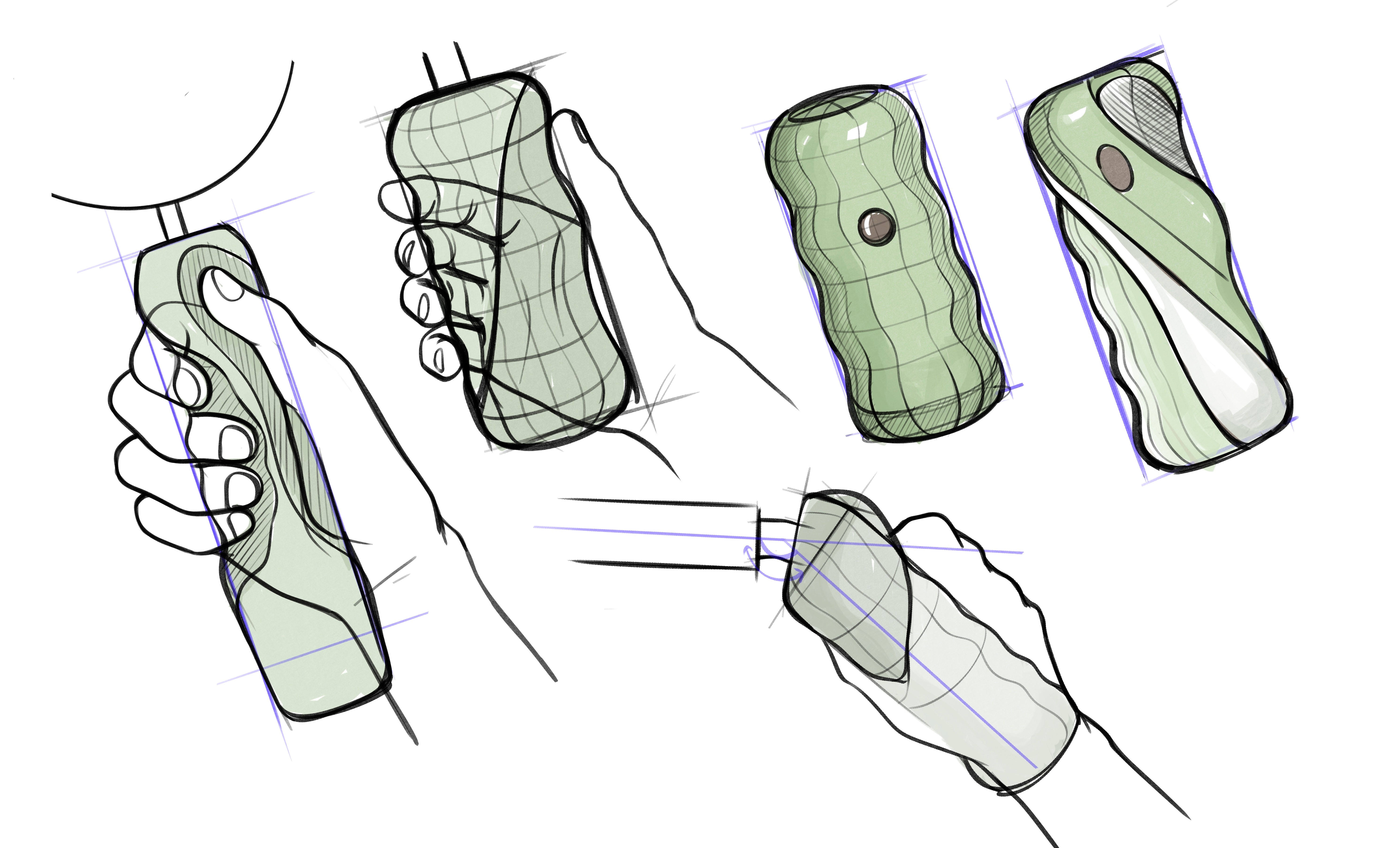 This phase involved a rapid ideation process to explore a wide range of ergonomic forms. Through loose sketches and structured wireframes, I investigated various contours and grip architectures to optimize comfort and control. This iterative process of sketching and refining was crucial in defining the final, user-centric shape of the handle, ensuring a secure and natural fit for the hand.